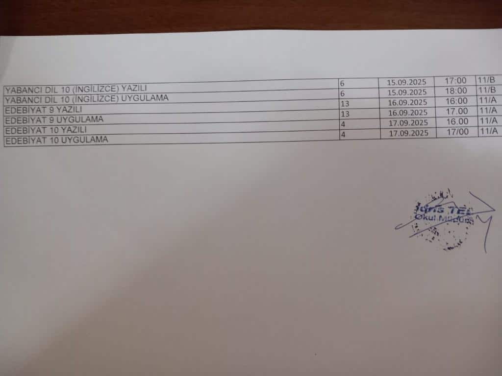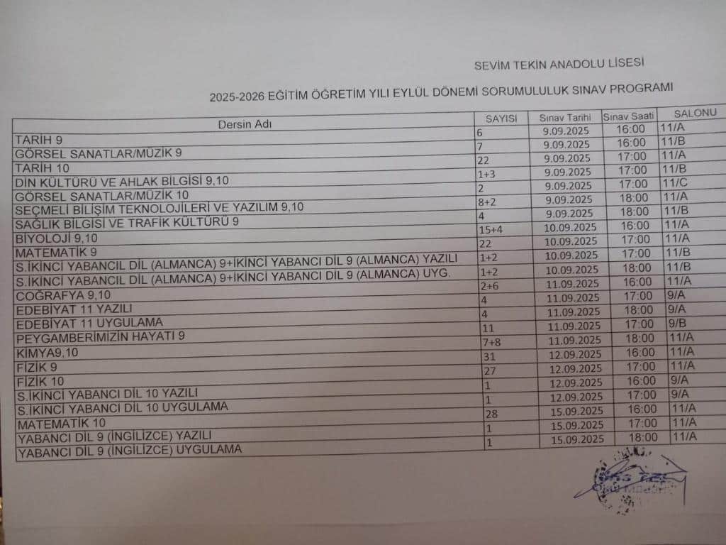 2025 2026 EĞİTİM ÖĞRETİM YILI EYLÜL DÖNEMİ SORUMLULUK SINAVI TAKVİMİ BELİRTİLEN GÜN VE SAATTE SINAVLAR YAPILACAKTIR.ÖĞRENCİLERİMİZE DUYURULUR.
