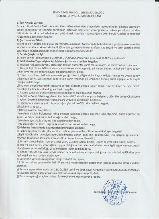 SERVİS ÇALIŞTIRMA İLANI İLGİLİLERE DUYURULUR.